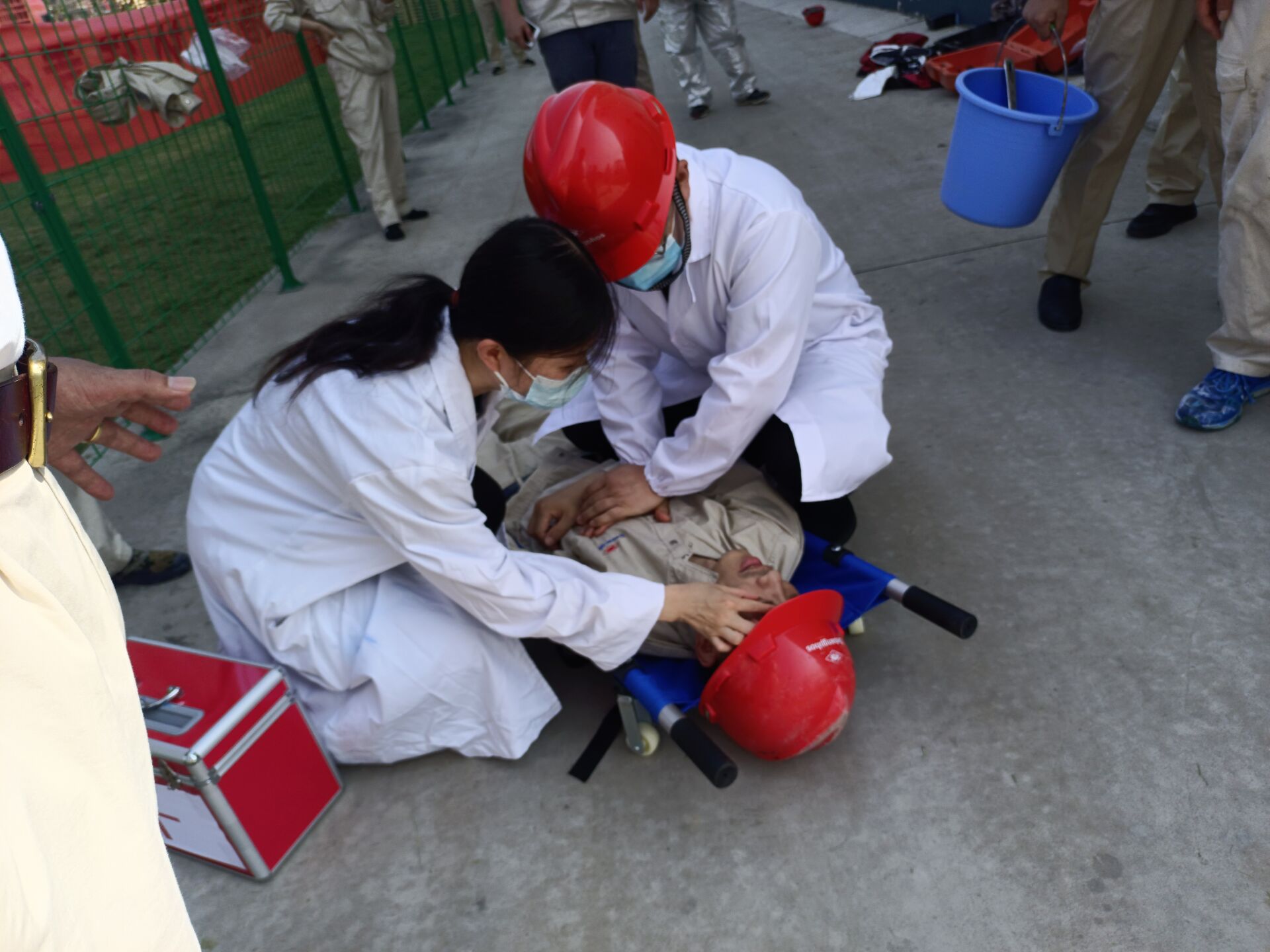 本次演練模擬黃磷在使用過程中,存在管道故障等異常時發生黃磷泄漏。事故發生后生產部立即向公司領導及相關部門進行報告,公司領導、安環部、公用工程部、辦公室等相關部門接到事故報告后,第一時間趕到現場,公司立即啟動應急處置預案,成立事故現場指揮部,進行應急救援處置工作。