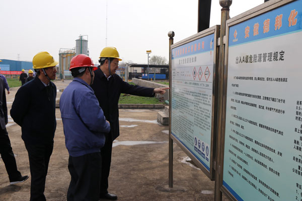 3月23日上午,淮南市委常委、副市長(zhǎng)楊東坡一行蒞臨安徽德邦公司檢查安全生產(chǎn)工作。市經(jīng)濟(jì)技術(shù)開發(fā)區(qū)管委會(huì)主任張海濤,市應(yīng)急管理局局長(zhǎng)李寶云等省市安全專家一起陪同檢查。楊市長(zhǎng)一行在公司領(lǐng)導(dǎo)的陪同下分別來(lái)到液氨貯槽和甲醇罐區(qū)實(shí)地查看安全生產(chǎn)運(yùn)行情況,要求企業(yè)認(rèn)真汲取江蘇省鹽城市響水縣天嘉宜化工有限公司“3•21”爆炸事故教訓(xùn),全面排查治理安全隱患,嚴(yán)格落實(shí)安全生產(chǎn)責(zé)任制,開展全員安全警示教育,扎實(shí)做好當(dāng)前化工和危險(xiǎn)化學(xué)品安全生產(chǎn)工作,嚴(yán)防各類事故的發(fā)生。